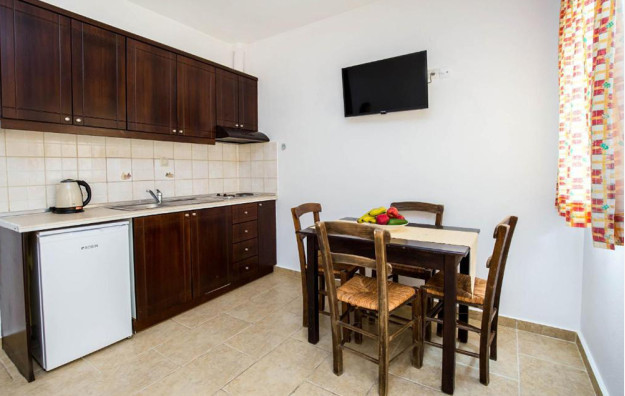 Opis: Vila poseduje dvokrevetna i dvokrevetna studija sa pomoćnim ležajem, smeštena u prizemlju i na prvom spratu. Prostor ispred studija u prizemlju je u funkciji zajedničke terase, a svaki ima svoju garnituru za sedenje. Studija na spratu imaju zajedničke-prolazne terase. Svaki studio poseduje mini čajnu kuhinju, kupatilo/wc, peškire, WiFi internet, TV, klima uređaj (uz doplatu na licu mesta od 6e dnevno). Na oko 200 metara se nalaze prodavnice, pekara, apoteka