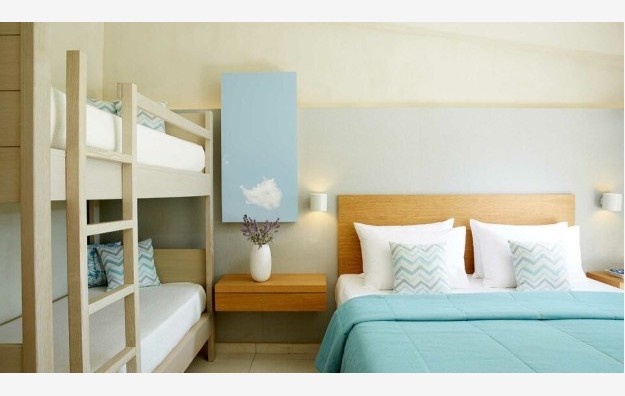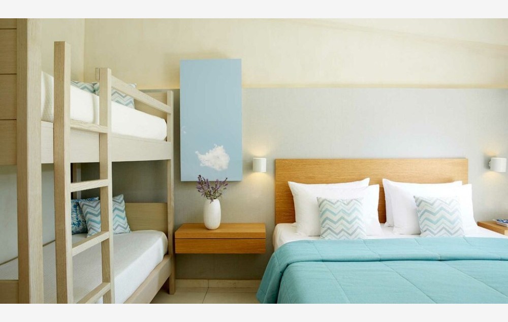 Superior Family Suite-44 m2, smešteni u prostranom vrtu Makriammos, novorenovirani porodični apartmani imaju dve nezavisne spavaće sobe sa bračnim ili dva odvojena kreveta i sofom na razvlačenje, koje dele zajedničko kupatilo sa tušem i nameštenu verandu sa pogledom na šumu.