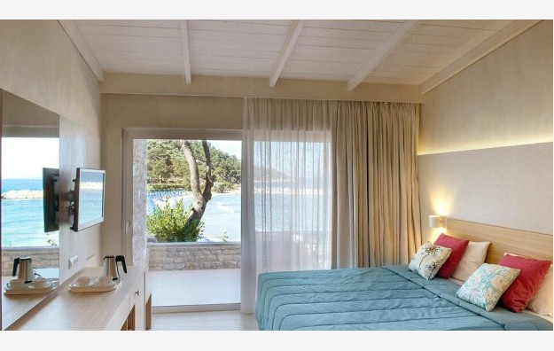 Seafront Deluxe Room-24 m2, na ekskluzivnom mestu, odmah iznad plaže Makriammos, 6 deluk soba na obali mora imaju bračni ili dva odvojena kreveta i sofu na razvlačenje, privatna kupatila sa tušem i nameštenu verandu sa pogledom na more.
